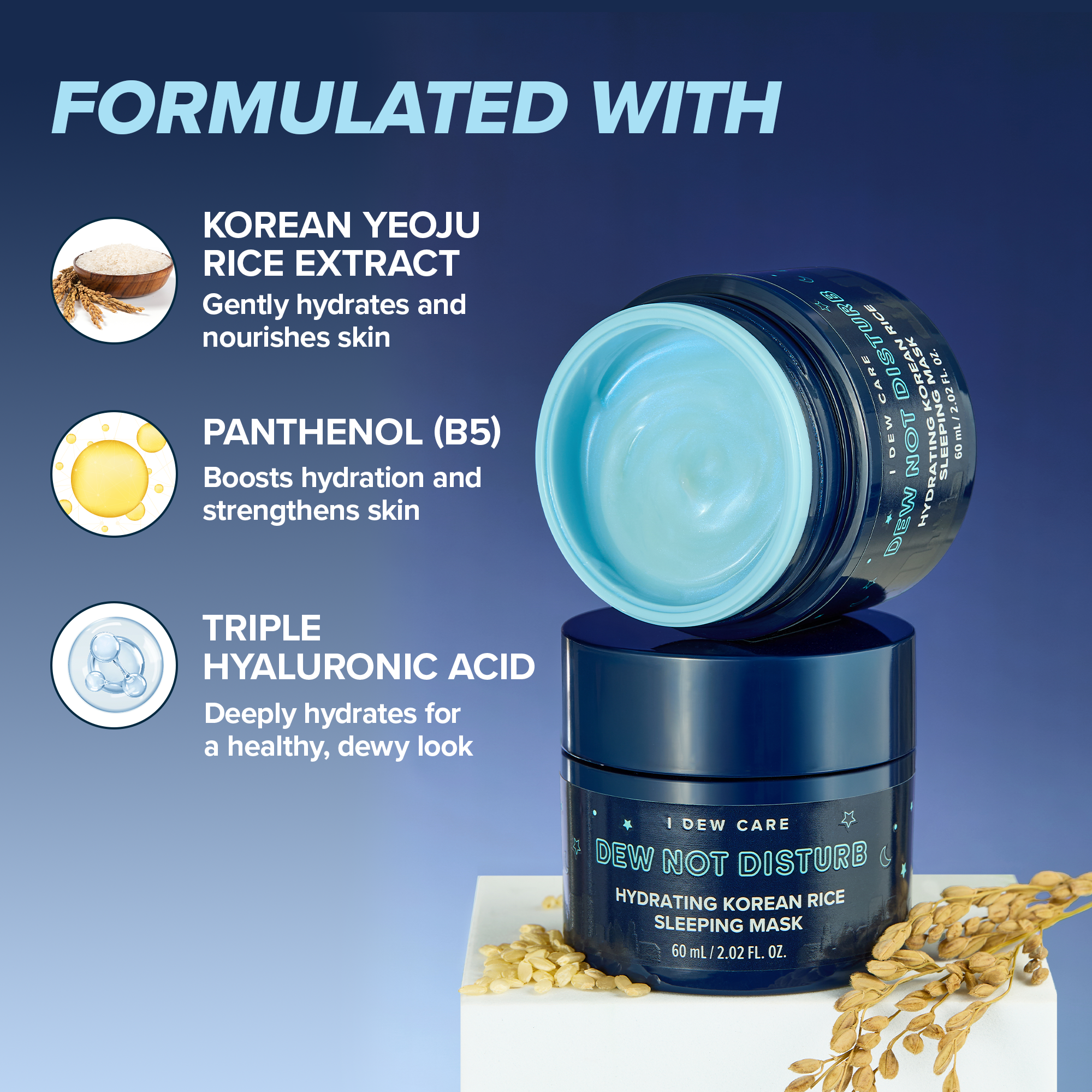 Wake up to radiant skin with this hydrating overnight mask infused with Korean rice extract*, hyaluronic acid, and vitamin B5**.